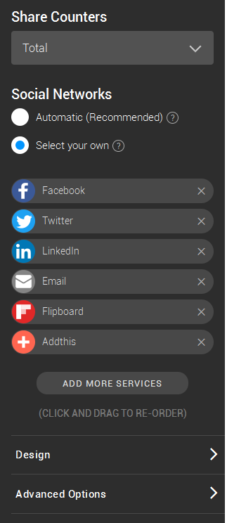 - Click on continue and select the options – AddThis has a lot of options, and lets you change a number of things. Select the networks you want or leave it on Automatic. I set mine to what I felt might be more relevant for visitors to the site.