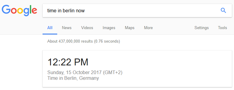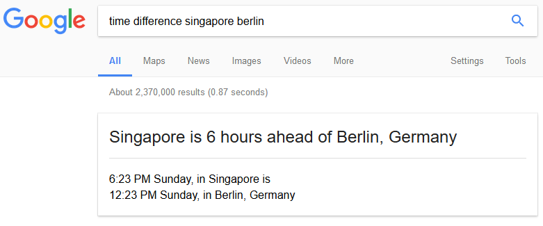 Let’s start with the most obvious one – Google Search. Google handles a lot of questions very well and time zone queries are handled surprisingly well. Just head on over to Google and enter a query like this "time in berlin now" and it will immediately help you with that. Google also handles queries like "time difference singapore berlin" – and it will promptly tell you that Singapore is six hours ahead.