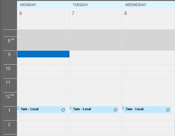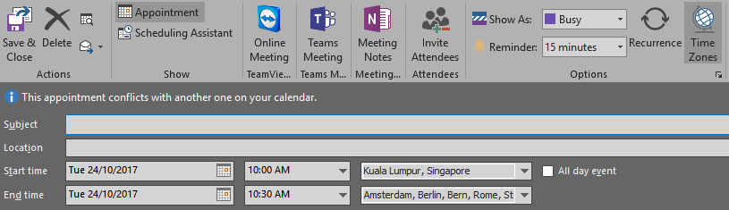 So, this works well in Google Calendar. Unfortunately, Office 365 Online Calendar doesn’t handle time zones (yet). So, you’ll have to do the math yourself when planning the appointments in the destination time zone. But if you are using Outlook with your Office 365 subscription, then just use the Time Zone feature there to get the same ability as Google Calendar.