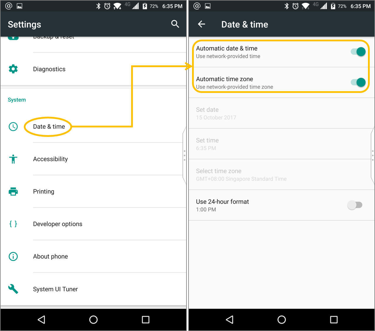 For Android phones, just go to settings, then down to System and select Time & Date – finally, ensure that the settings for automatically updating the time and the time zone are enabled.