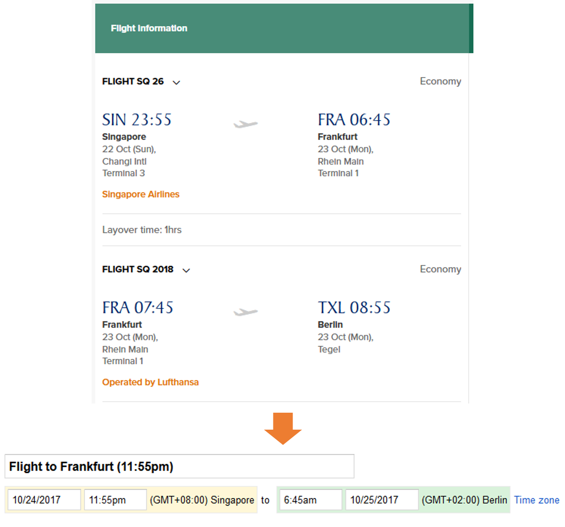 Using this, you can transform the flight details into the calendar entries as below.