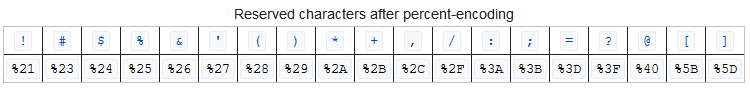 The picture below is a snapshot from the Wikipedia page of the reserved characters.
