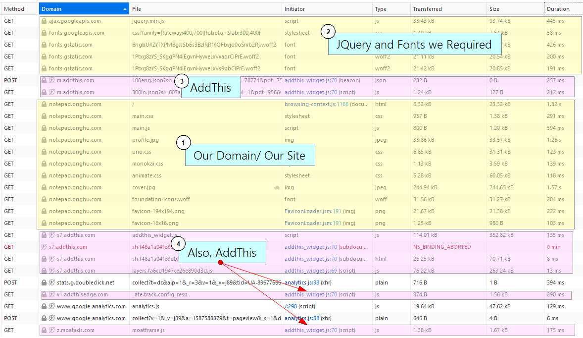 It’s a known thing that we should reduce the number of network requests that we make when we load a page. Also, it helps to reduce the different domains that we require to use. In my browser (Firefox), I pressed F12 to launch the developer tools and went to the network tab, and did a Ctrl-F5 to reload the whole page to see te network requests, domains and the durations.