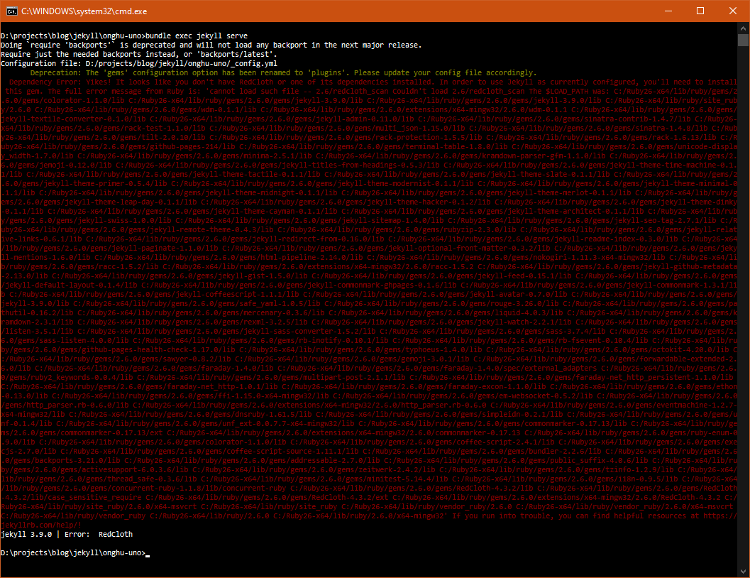 bundle exec jekyll serve We get a couple of messages (we’ll look at that in a moment) but we are hit with a wall of red!