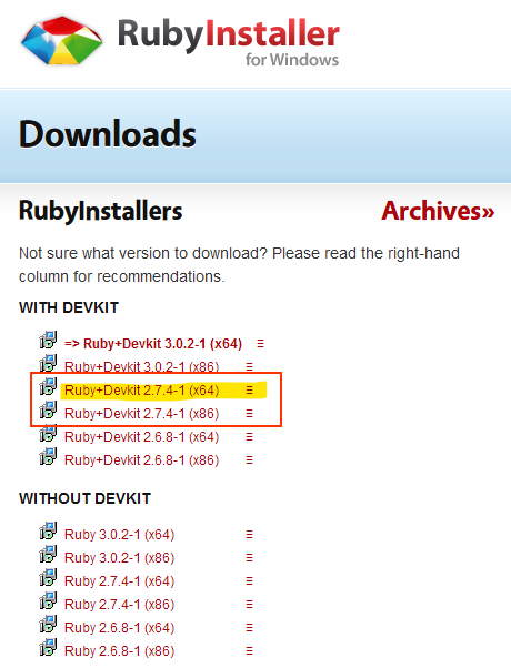Head on over to the RubyInstaller Downloads site and grab the package for Ruby+Devkit 2.7.4-1 (x64) (it’s approximately 140MB). In general, you would want to get the 64-bit package (x64) but in case you want the 32-bit, you should get the x86 package listed below it. For widest compatibility with all types of gems including C native extensions, you should get the ‘Ruby+Devkit’ package though if you only want the Ruby runtime, the package without Devkit (listed further down) would also work. I would strongly recommend getting the package with Devkit. The screenshot below shows the different items listed on the page.