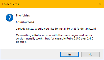 Since we created the folder before the installation (to set the attribute for compressing it), the Ruby installer will warn you that the folder already exists and will ask to confirm that it is OK to proceed. Our folder is empty and it is OK to go ahead! Click Yes.