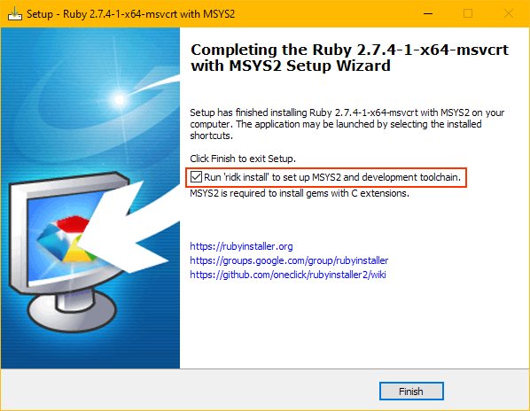 This finally comes to the screen that tells you that the main installation is done and the next step is to move on to the MSYS2 Setup. Check the option to ‘Run ridk install’ so that it can proceed and click ‘Finish’. Note also the important links that are shown here.