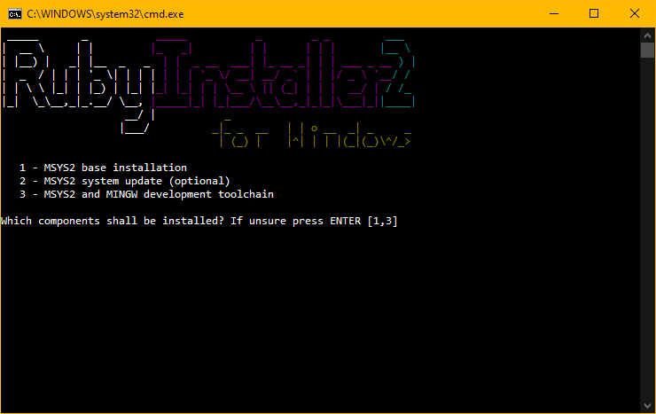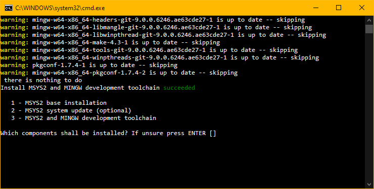 This then brings us the Command Line based installation for the MSYS2 toolchain. I would recommend that you either choose 1,2,3 or just use the default 1,3 at this stage. (To use the default, you can also just press ENTER).