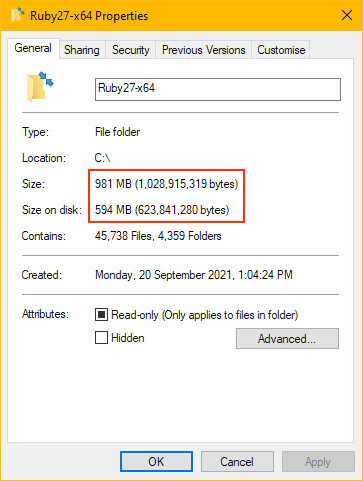 So, yes, we do seem to have Ruby 2.7.4 on our computer now. We also installed everything to C:\Ruby27-x64 and can go and take a look at the files and folders there. Talking about that folder, you can now right click on that folder and check properties again. The exact numbers might be different, but you will likely see something like this. On my computer, the actual file sizes are approximately 980MB but on disk, it’s only taking 590MB – so, I saved almost 400MB by setting the folder to be compressed. Also, since this is applied to all the files and folders, as you install more gems, those will also be automatically compressed and will continue to take up lesser disk space.