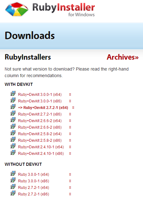- Download RubyInstaller for Windows: https://rubyinstaller.org/downloads/