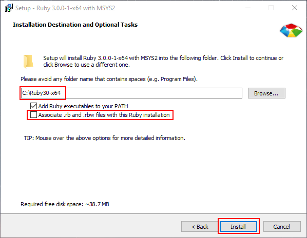This takes us to the next page and asks us for the path, whether it should add Ruby to our system path and if it should associate Ruby files with this installation. I personally prefer to uncheck the second option so that I have more choice in which Ruby version runs the script. Ensure that the path shown matches the folder that we had set to be compressed.