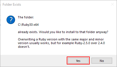 Since we created the folder before the installation (to set the attribute for compressing it), the Ruby installer will warn you that the folder already exists and will ask to confirm that it is OK to proceed. Our folder is empty and it is OK to go ahead! Click Yes.