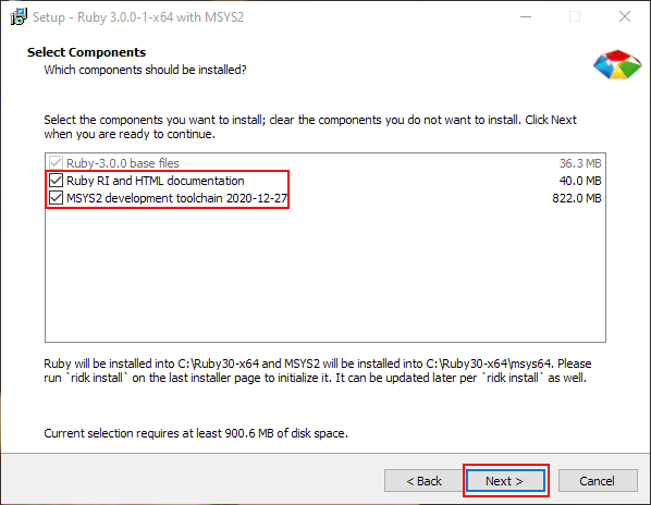 In general, it is a good idea to install all these components since it makes the documentation available to you offline, and also prepares the MSYS2 development toolchain which is needed for compiling native gems. Select everything and click Next.