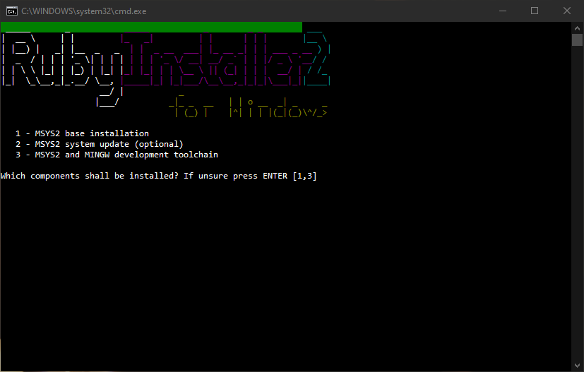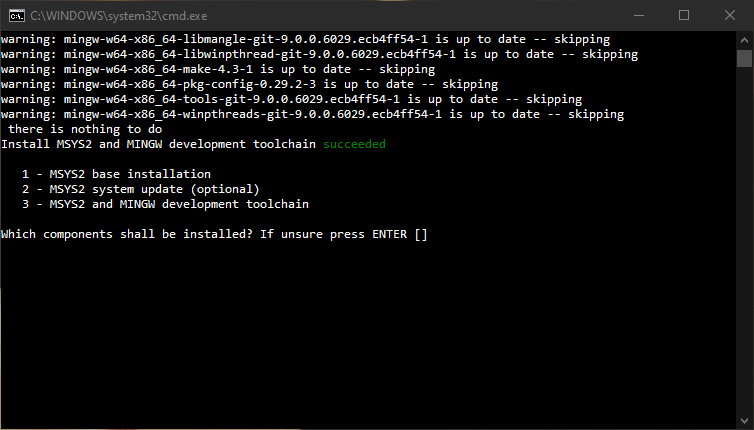 This then brings us the Command Line based installation for the MSYS2 toolchain. I would recommend that you either choose 1,2,3 or just use the default 1,3 at this stage.