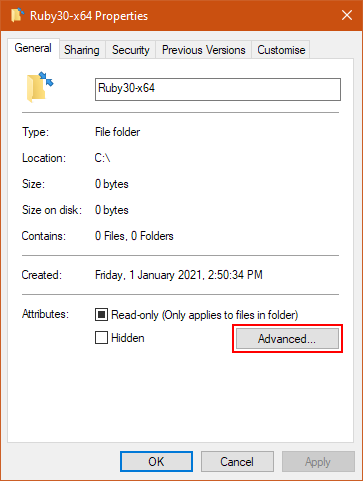 Ruby30-x64– this is where we will install Ruby 3.0 - In Explorer then, right click on the new folder and click Properties which brings up a menu like the one you see below.