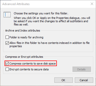 - Check the setting for ‘Compress contents to save disk space’ – this will ensure that the file in this folder are compressed on the disk and will save you a lot of space on the installation. At the end of the installation, we will see how much!