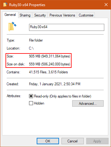 So, yes, we do seem to have Ruby 3.0.0 on our computer now. We also installed everything to C:\Ruby30-x64 and can go and take a look at the files and folders there. Talking about that folder, you can now right click on that folder and check properties again. The exact numbers might be different, but you will likely see something like this. On my computer, the actual file sizes are approximately 905MB but on disk, it’s only taking 559MB – so, I saved almost 350MB by setting the folder to be compressed. Also, since this is applied to all the files and folders, as you install more gems, those will also be automatically compressed and will continue to take up lesser disk space.