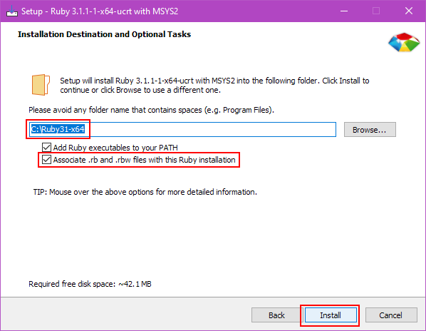 This takes us to the next page and asks us for the path, whether it should add Ruby to our system path and if it should associate Ruby files with this installation. I personally prefer to uncheck the second option so that I have more choice in which Ruby version runs the script. Ensure that the path shown matches the folder that we had set to be compressed.