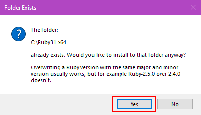 Since we created the folder before the installation (to set the attribute for compressing it), the Ruby installer will warn you that the folder already exists and will ask to confirm that it is OK to proceed. Our folder is empty and it is OK to go ahead! Click Yes.