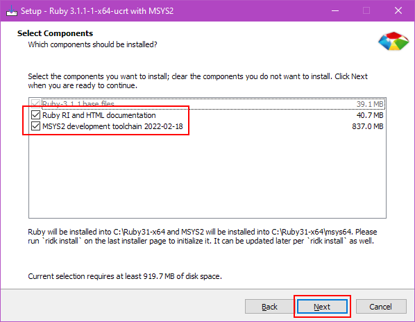 In general, it is a good idea to install all these components since it makes the documentation available to you offline, and also prepares the MSYS2 development toolchain which is needed for compiling native gems. Select everything and click Next.