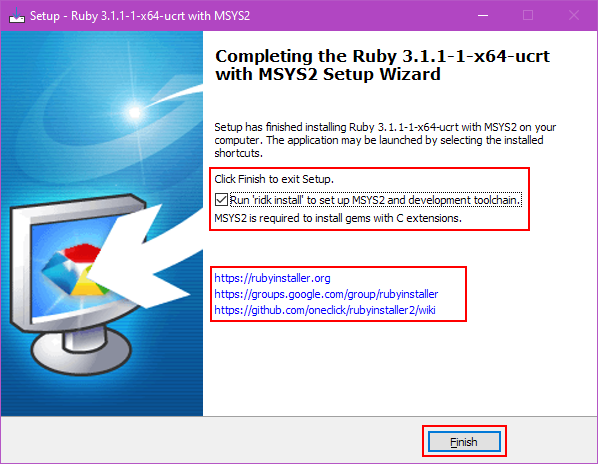 This finally comes to the screen that tells you that the main installation is done and the next step is to move on to the MSYS2 Setup. Check the option to ‘Run ridk install’ so that it can proceed and click ‘Finish’. Note also the important links that are shown here.