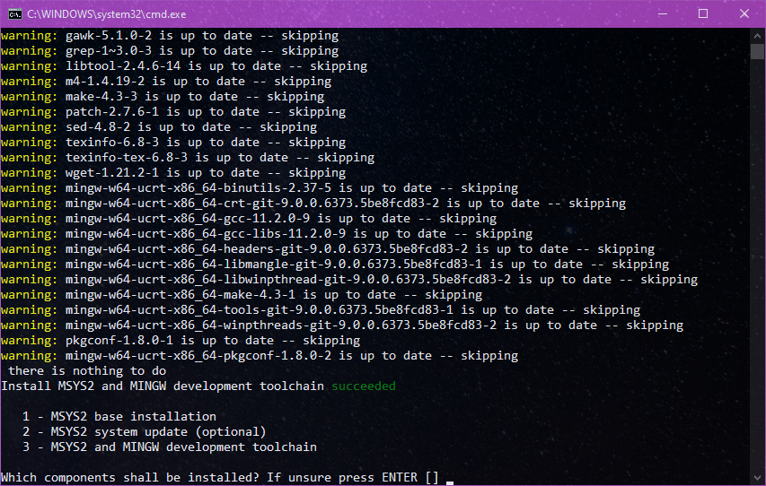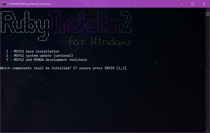 This then brings us the Command Line based installation for the MSYS2 toolchain. I would recommend that you either choose 1,2,3 or just use the default 1,3 at this stage.