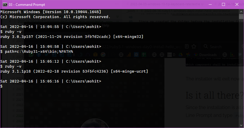In my case, you see that it did not appear to work straight off – it showed a Ruby 3.0.3 installation. This is because at an earlier step, I did not ask the installer to add it to the PATH. So, we need to do it manually (for now) by doing path=c:\Ruby31-x64\bin;%PATH% which puts the new installation at the top of the path. It all looks good now!