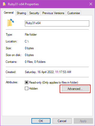Ruby31-x64– this is where we will install Ruby 3.1 - In Explorer then, right click on the new folder and click Properties which brings up a menu like the one you see below.