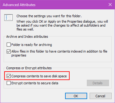 - Check the setting for ‘Compress contents to save disk space’ – this will ensure that the file in this folder are compressed on the disk and will save you a lot of space on the installation. At the end of the installation, we will see how much!