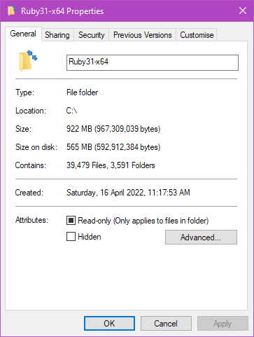 So, yes, we do seem to have Ruby 3.1.0 on our computer now. We also installed everything to C:\Ruby30-x64 and can go and take a look at the files and folders there. Talking about that folder, you can now right click on that folder and check properties again. The exact numbers might be different, but you will likely see something like this. On my computer, the actual file sizes are approximately 922MB but on disk, it’s only taking 565MB – so, I saved just more than 350MB by setting the folder to be compressed. Also, since this is applied to all the files and folders, as you install more gems, those will also be automatically compressed and will continue to take up lesser disk space.