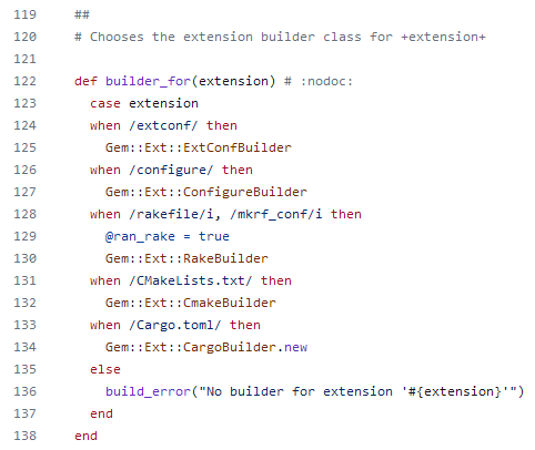 Once the gem is being installed, the extensions line is handled by the builder which in turn checks the kind of extension and invokes the correct builder (in our case, the Gem::Ext::ExtConfBuilder) that generates and executes the Makefile for this extension. If you’re curious (and you probably are), these are the builders specified in the builder code. The last one (Cargo.toml) is used for Rust extensions.