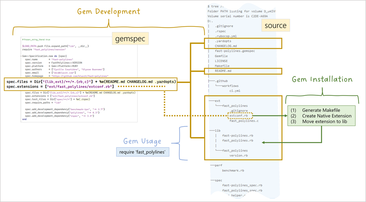 The Ruby code files are straightforward and you can see the files in the path under lib and that is the same as any Ruby gem. For the native code, however, there are two parts to setting things up: