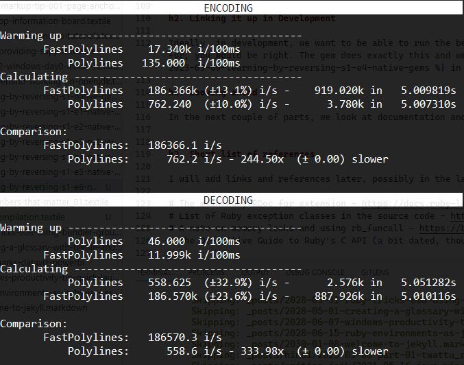 If you implement some functionality in a native C gem for improving the performance, you will normally want to include a benchmark to show the benefit. The fast_polylines gem does this – we look at how it is done. The ideas here are not specific to native gems and would work for anything that you want to benchmark.