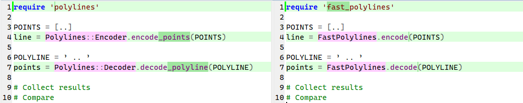 | Decode method | Polylines::Decoder.decode_polyline(POLYLINE) | FastPolylines.decode(POLYLINE) |