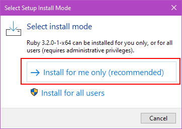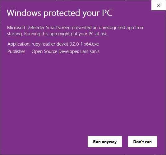 - Download RubyInstaller for Windows: https://rubyinstaller.org/downloads/
