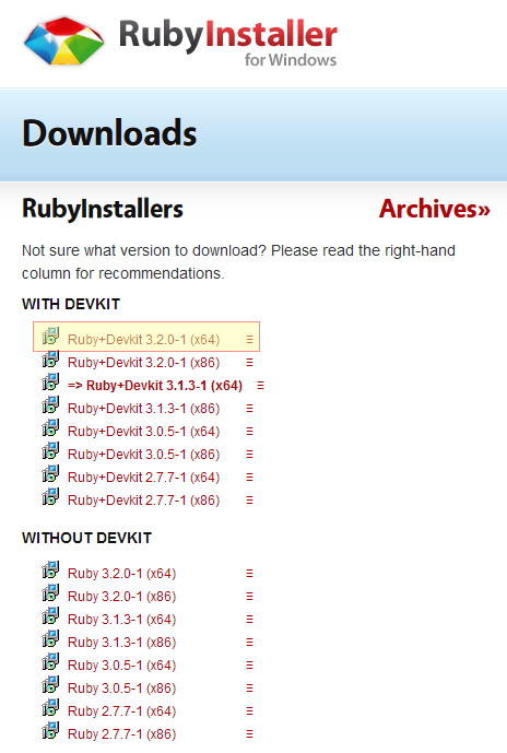 Head on over to the RubyInstaller Downloads site and grab the package for rubyinstaller-devkit-3.2.0-1-x64 (it’s approximately 125MB). In general, you would want to get the 64-bit package (x64) but in case you want the 32-bit, you should get the x86 package listed below it. For widest compatibility with all types of gems including C native extensions, you should get the ‘Ruby+Devkit’ package though if you only want the Ruby runtime, the package without Devkit (listed further down) would also work. I would recommend getting the package with Devkit. The screenshot below shows the different items listed on the page.