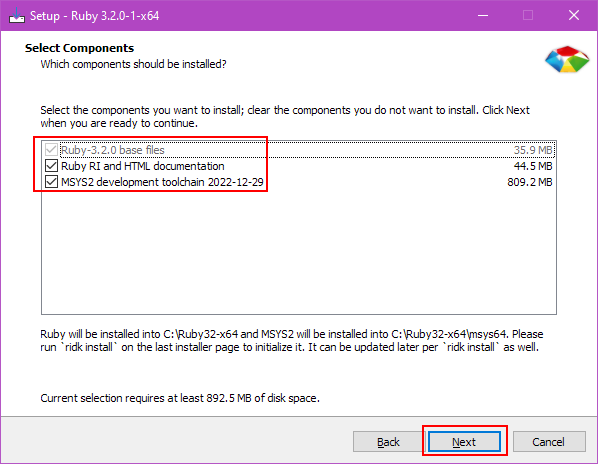 In general, it is a good idea to install all these components since it makes the documentation available to you offline, and also prepares the MSYS2 development toolchain which is needed for compiling native gems. Select everything and click Next.