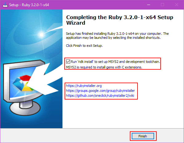This finally comes to the screen that tells you that the main installation is done and the next step is to move on to the MSYS2 Setup. Check the option to ‘Run ridk install’ so that it can proceed and click ‘Finish’. Note also the important links that are shown here.