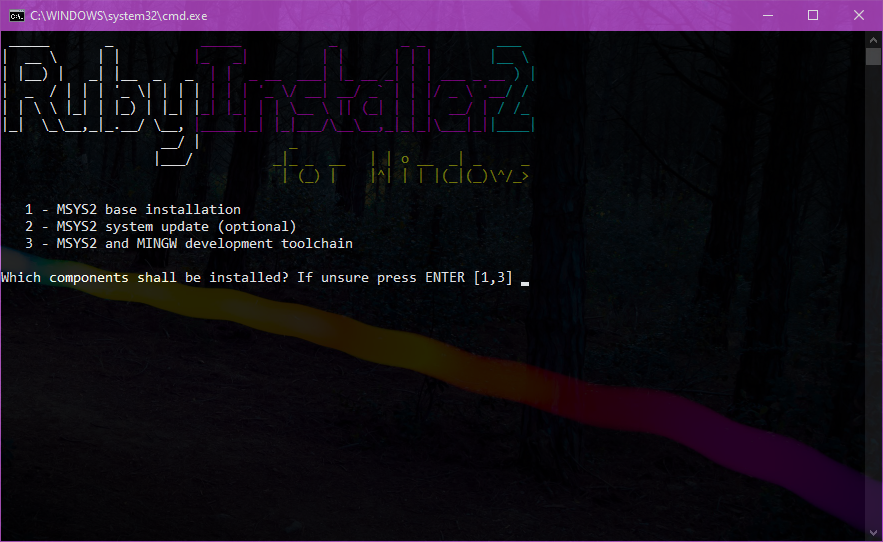 This then brings us the Command Line based installation for the MSYS2 toolchain. I would recommend that you either choose 1,2,3 or just use the default 1,3 at this stage.