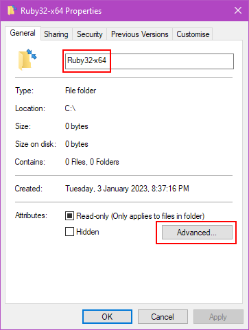 Ruby32-x64– this is where we will install Ruby 3.2 - In Explorer then, right click on the new folder and click Properties which brings up a menu like the one you see below.