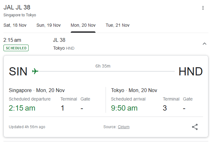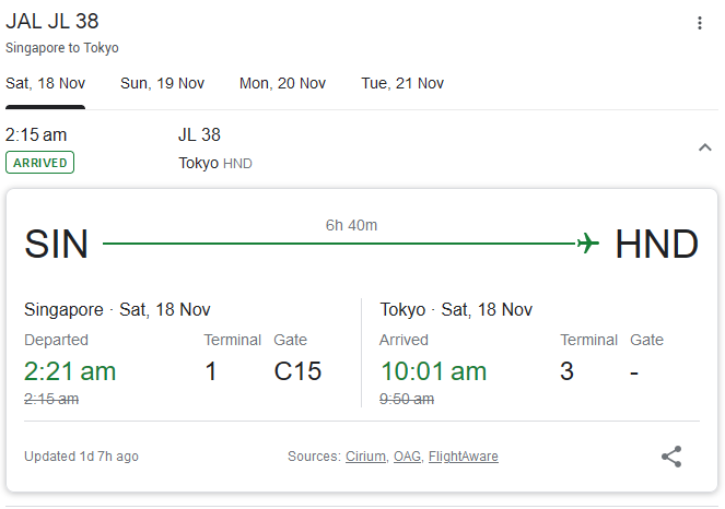 Whether I am receiving a passenger or tracking a flight for a loved one, or actually travelling myself, I now add another item to the calendar. In the details, I now add a link to a Google search of the flight. For example, if you’re taking the JL38 from Singapore to Haneda airport, I will add this link to the calendar: https://www.google.com/search?q=jl38 so that tapping it on my phone takes me to the latest information about the flight. It will show you something like the first pictute before the flight departs and the second one after it departs. (Tip: in general, you can set the term q=something after the URL of https://www.google.com/search? to create a Google search query).
