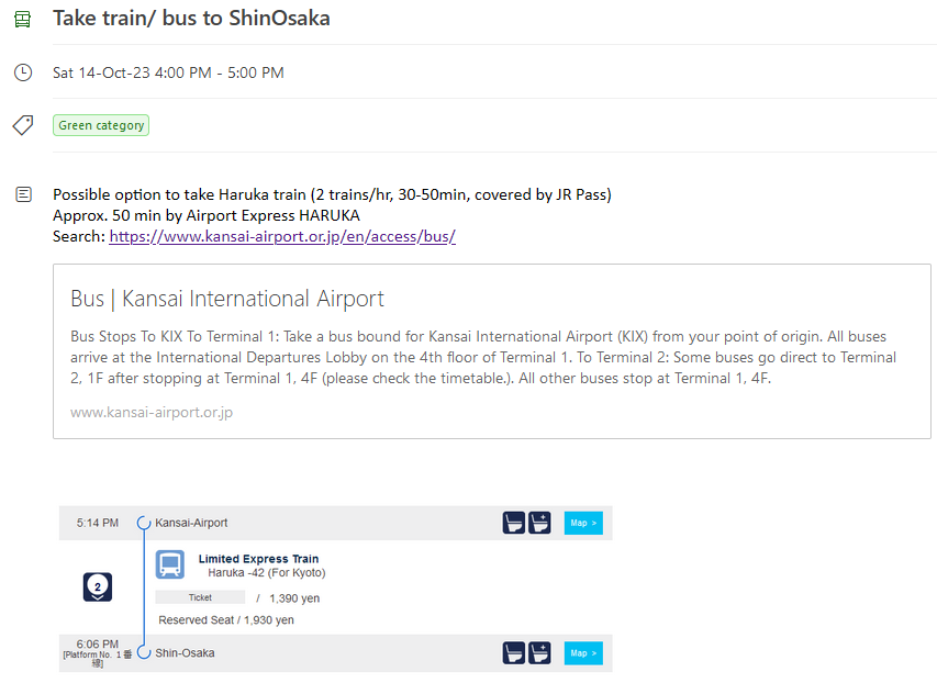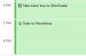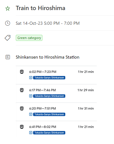 Finally, the last picture below shows the information added to the calendar for the last part of the trip – the bullet train travel from Osaka to Hiroshima. Here, I take a screenshot of the few trains at about that time so that I know the options for travel at that time. Also, it gives me quick information on whether I should rush.