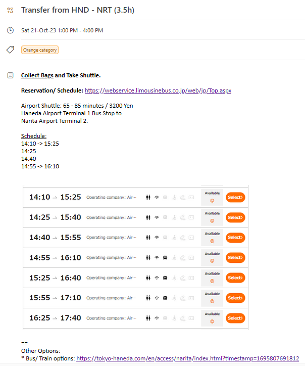 If I need to change flights at an airport, I try to find the information in advance and add it to the calendar between the entries of the landing flight and the departure flight. Then, I also add the transfer as an entry in the calendar (e.g., ‘Transfer @ KUL – 1h15m’) with the duration in the calendar item title so that it’s easily available when I look at the phone. If I have the details, I will also add more details in the body of the calendar item. This could include things like collect bags, check-in information, transfer to local terminal, take bus from stop 8c, and so on, so that I have all the relevant information at hand. In some cases, you need to change airports (not just terminals) and I would add information about the bus route or train travel information.